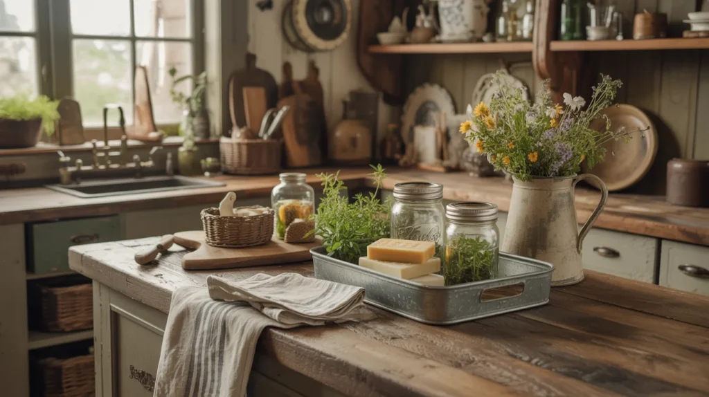 You build warmth with layers that feel gathered, not staged. Group wood cutting boards, ceramic crocks, and vintage-inspired canisters in odd numbers on the counter. For smart farmhouse kitchen decorating, keep only what you use daily within reach and rotate the rest.