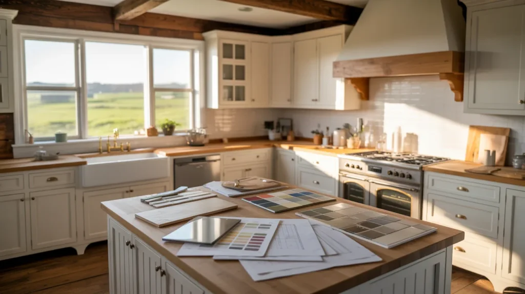 Begin your farmhouse kitchen makeover with a solid plan. In Phase 1 (2–4 weeks), define your project’s scope, budget, and essential elements. Collect finish samples and double-check measurements. Decide on your layout, ventilation path, and appliance choices from brands like GE Profile, KitchenAid, or Bosch.