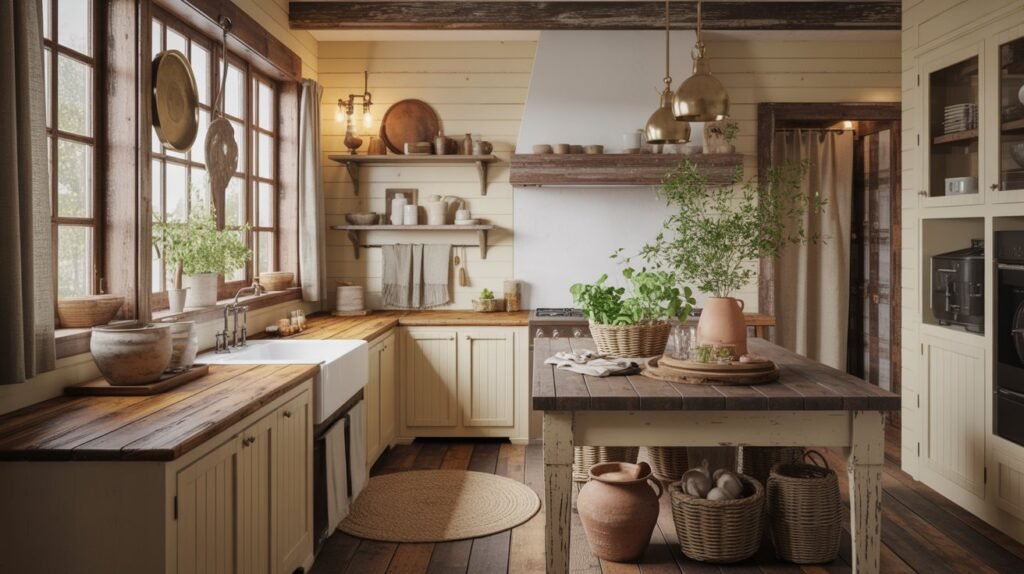 Imagine butcher block counters in maple or walnut, and apron-front sinks in fireclay. You’ll also see vintage-style pendants from Rejuvenation or Schoolhouse. There’s shiplap-wrapped range hoods, reclaimed oak, and layered textiles for cozy depth.